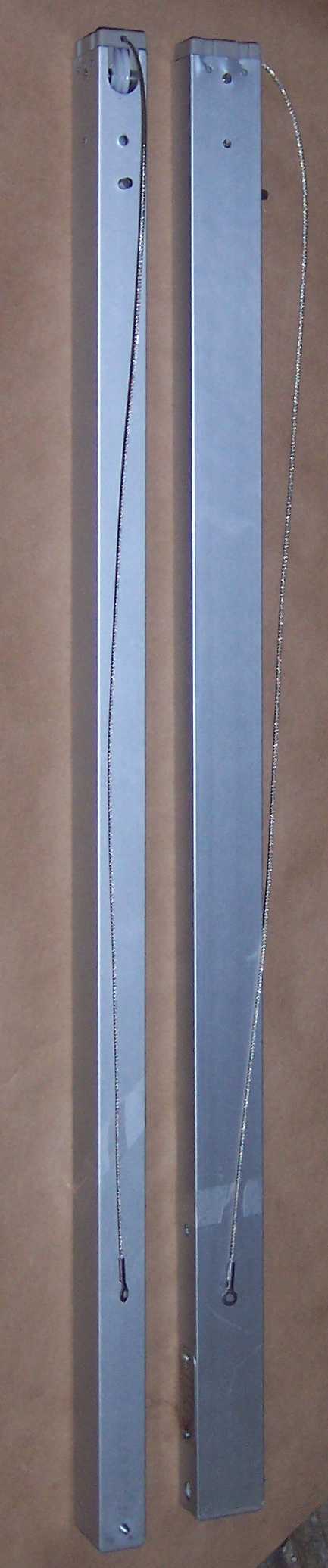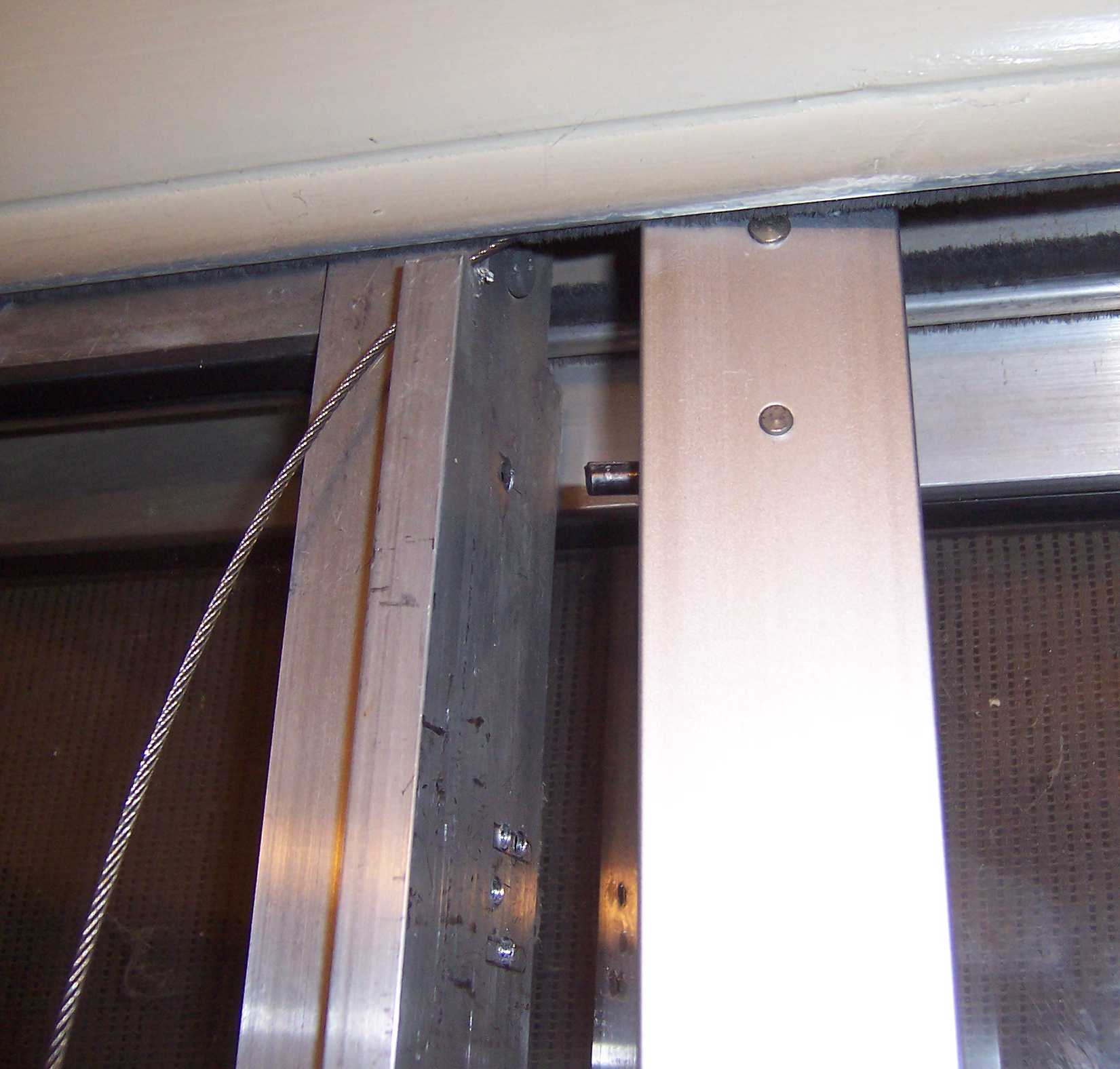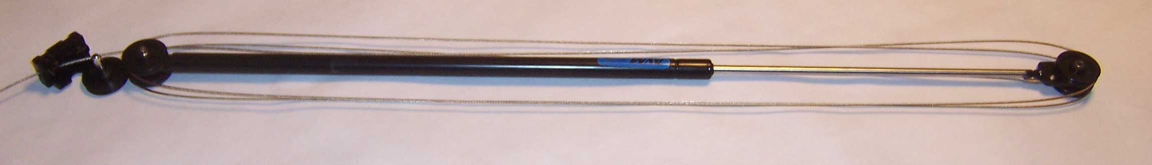 The KLOZIT Cable-Actuated Sliding Glass Door Closer uses a gas piston with 5 rollers and a stainless steel cable to make a block-and-tackle system. The closer mounts onto the side of the arcadia (patio) sliding glass door. The closer is held to the side of the door with a roll pin at the top and a single screw at the bottom. The cable is connected to the interior of the upper door frame with an eyelet and single screw. When the door is opened, the gas piston is compressed. When the door is released, the gas piston extends and pulls the cable back into the closer, pulling the door closed.